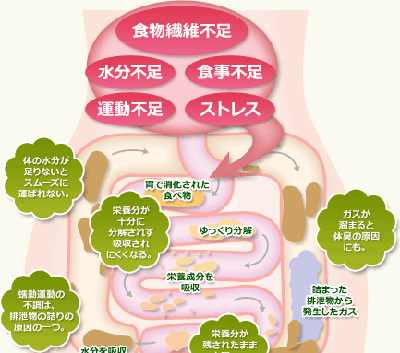 消化ということに対しては、便通が阻害される期間が長いと腸には常に食物の残りがある状態となるため、